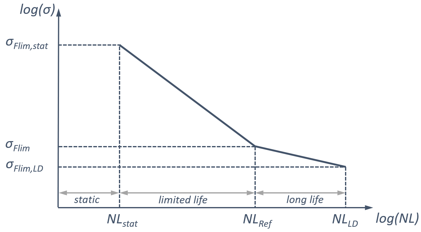 The SN-curve is defined by specifying the inflection points between the static and limited life sections and between the limited life and the fatigue strength sections, as well as the allowable long-term contact stress number.