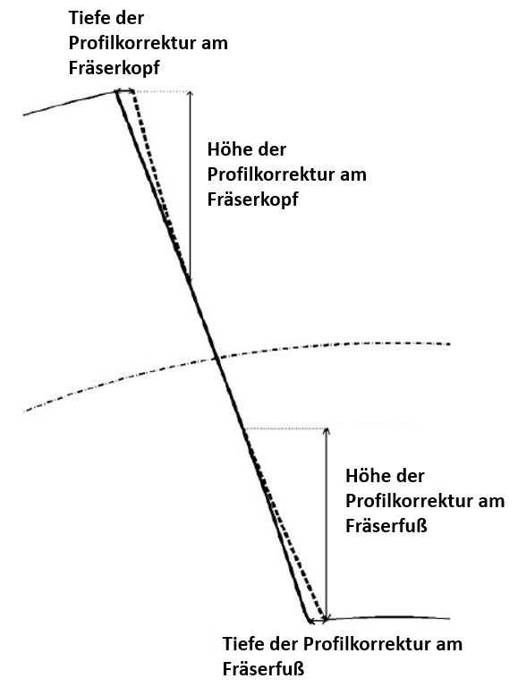 Für die Berechnung der lokalen Beanspruchngen könne Zahnflankekorrekturen am Schneckenrad durch Angabe der Höhe und Tiefe der Profilkorrekturen am Fräserkop und am Fräserfuß vorgegen werden. Die korrigierten Flanken werden dann entsprechend einer parabolischen korrektur verschoben.