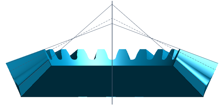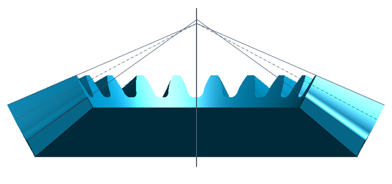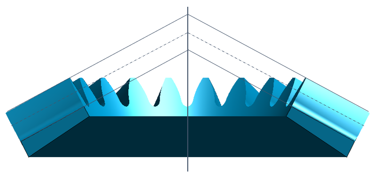 Modified slot width: The tooth depth changes over the tooth width. The root line of the wheel is rotated around the center with respect to the tooth width so that the slot width in the tooth root is constant. However, only the wheel has a constant slot width in the tooth root (see: constant slot width). At the pinion, the tooth depth is adjusted accordingly and thus a taper can occur in the pinion tooth root. The addendum angle θa and the dedendum angle θf are calculated internally according to ISO 23509. Only the wheel can be manufactured in the completing process.