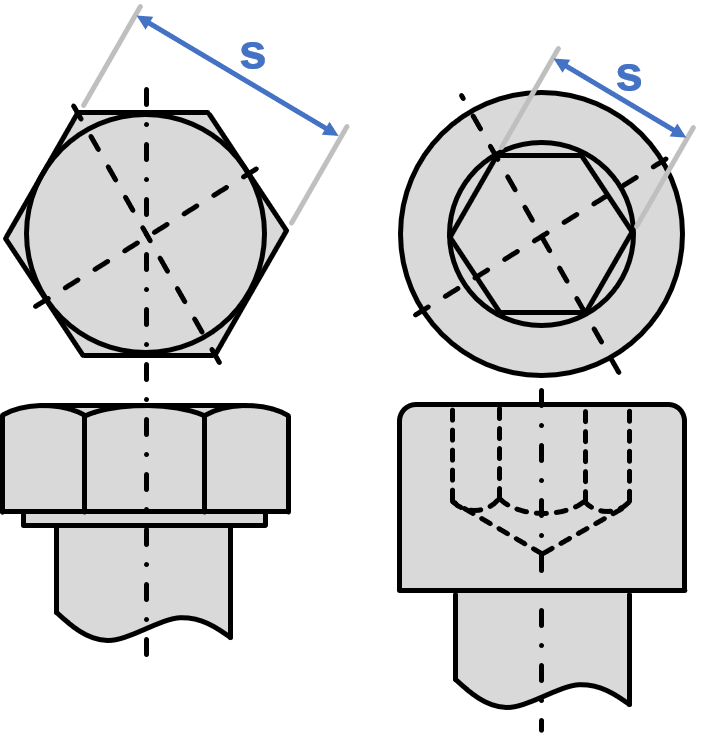 Die Schlüsselweite s gibt den Abstand zweier paralleler Flächen am Schraubenkopf an, die zur Drehmomentübertragung mittels Formschluss dienen. Diese Größe wird bei Werkzeugen wie z.B. bei Gabel- und Innsechskantschlüsseln verwendet, aber auch an der dazugehörigen Schraube oder Mutter.