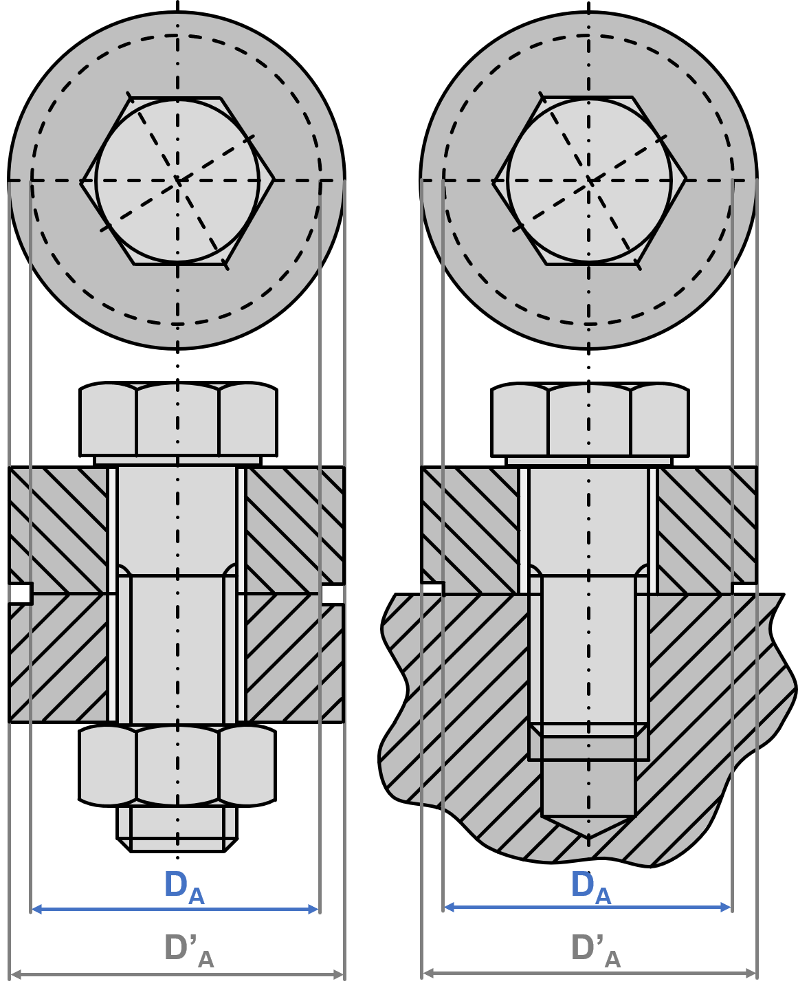 Der Ersatzaußendurchmesser des Grundkörpers in der Trennfuge DA wird benötigt um zu bestimmen, ob der Verformungskegel sich voll ausbilden kann oder eine Verformungshülse zu beachten ist. Dadurch entscheidet sich, wie die Plattennachgiebigkeit berechnet wird (R3).